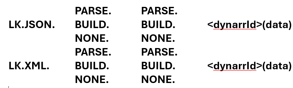 These functions start with the prefixes LK.JSON for JSON data and LK.XML for XML data. Following the prefix will be a first section with any of these 3 words: PARSE, BUILD or NONE. This section controls how to convert the data before reaching the subroutine. After it will follow another section with the same words, which controls how LinkarServer must process the response data from the subroutine before returning it. Following it there is another section where an identifier for the Dynamic Array that will be used for the conversions has to be specified. And finally there is a section with the data to be sent to the subroutine.