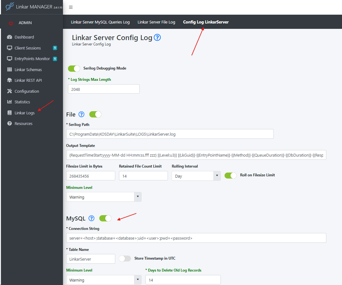 When LinkarServer is started and MySQL logs are enabled it will try to connect with MySQL. If the database schema or table do not exist they will be created. When encountering any problems with the connection it is advised to enable "Serilog Debigging Mode" and analyze the "Serilog.LinkarServer.log" file for debugging.