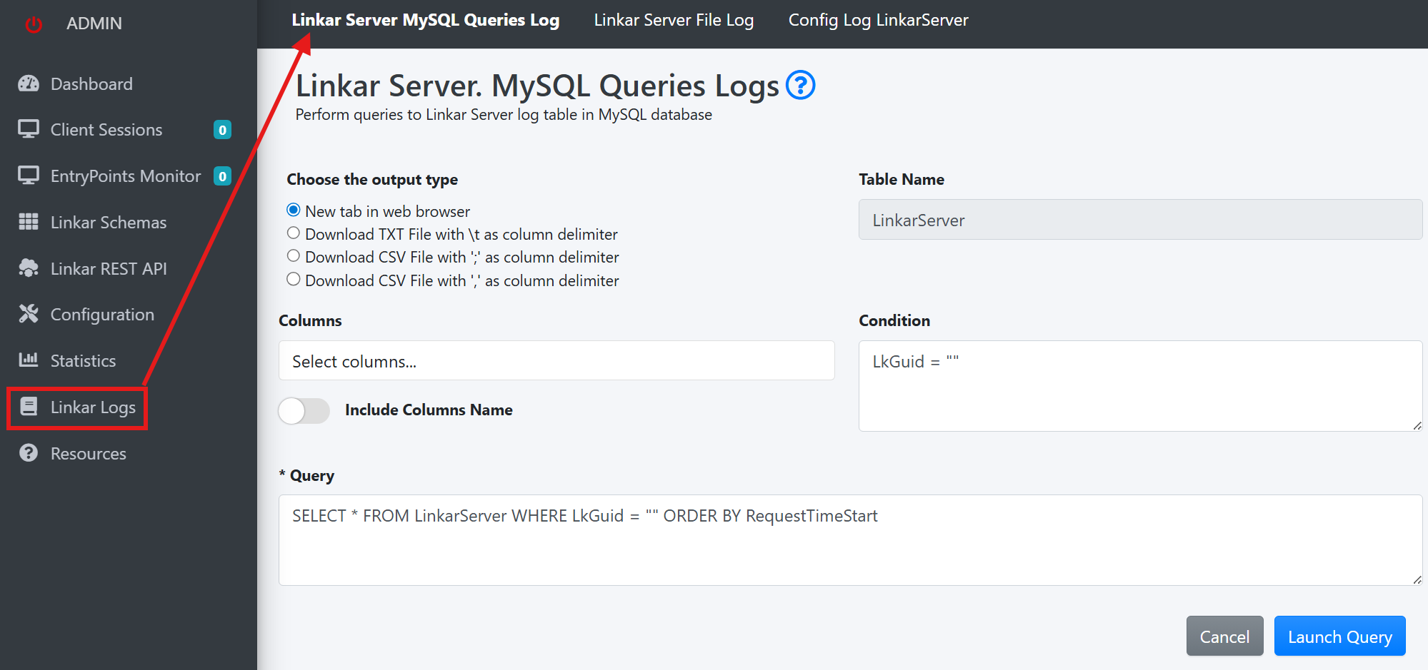 A query can be composed by typing it manually or using "Columns" and "Condition" to build it. If an error occurs, and if the LinkarServer alarm system is configured, automatic emails will be sent with information about the problem. The content sent will include the "LkGuid" property which identifies the operation that caused the error. In order to troubleshoot the issue a query to locate the problematic record can be formed by using the "LkGuid".