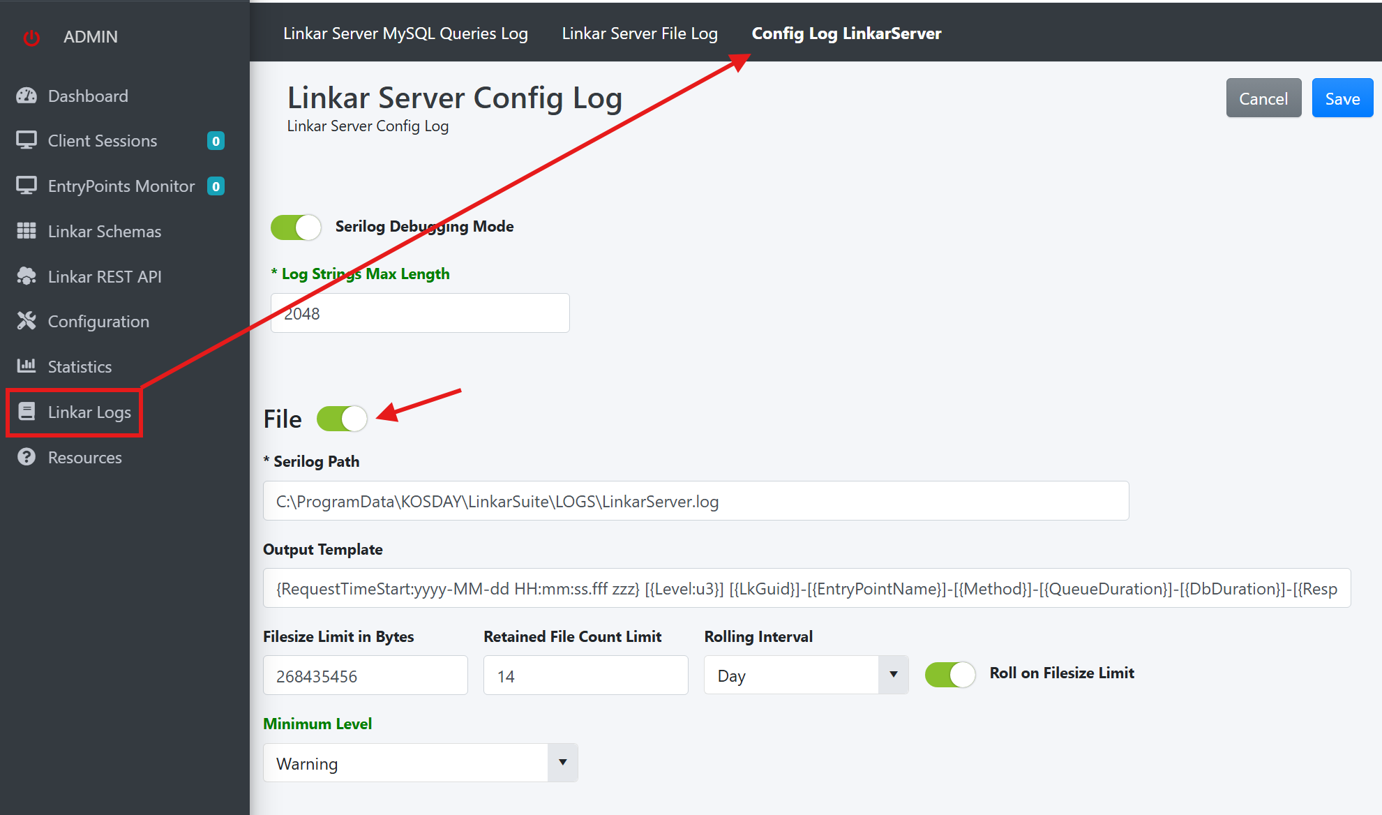 The complete system path to the log configuration file. The default path changes with the operating system in the system where LinkarServer is installed: •Windows: %ProgramData%\KOSDAY\LinkarSuite\LOGS •Linux: /etc/KOSDAY/LinkarSuite/LOGS Serilog will add the date at the end of the file name. |