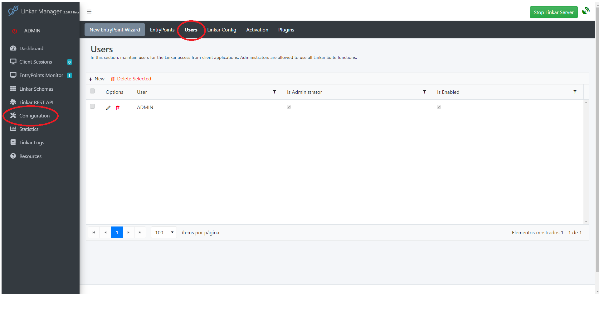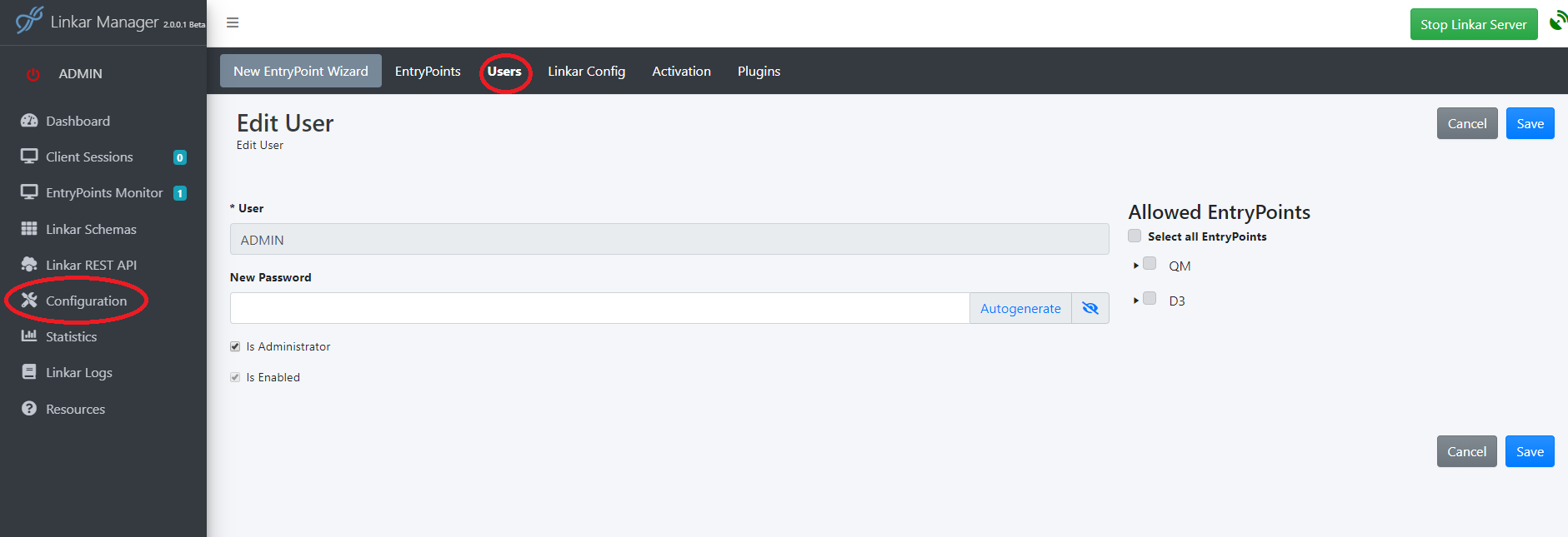 Grant the user full permissions: he is authorized to connect to ALL EntryPoints and the Linkar MANAGER.