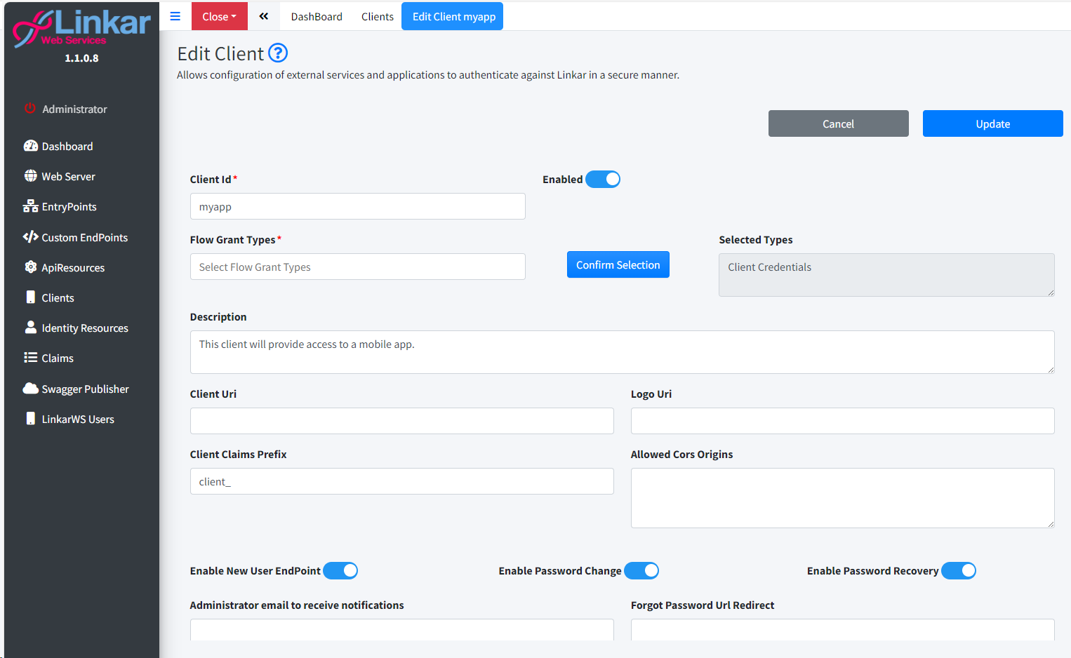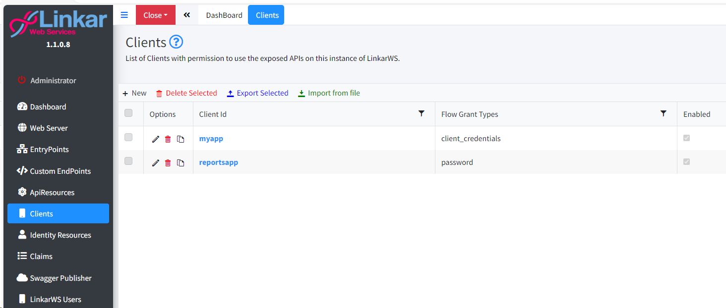 Each application that wants to interact with LinkarWS must identify itself as a valid client through a client_id. For this reason, clients authorized to work with LinkarWS must be registered beforehand.