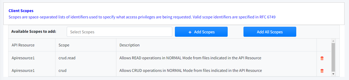 Through Scopes we are going to filter and define the different resources allowed to the Client. You can assign any or all of the Scopes defined in the different existing ApiResources