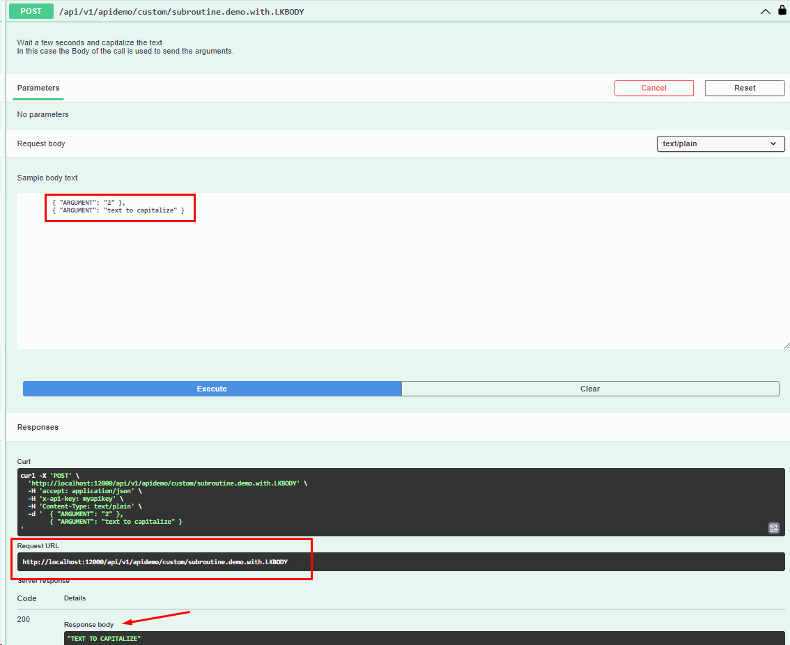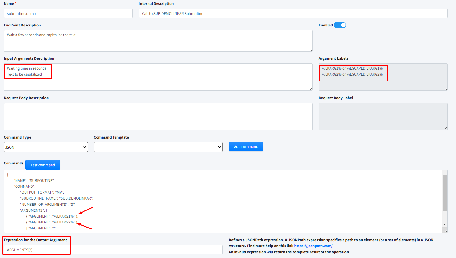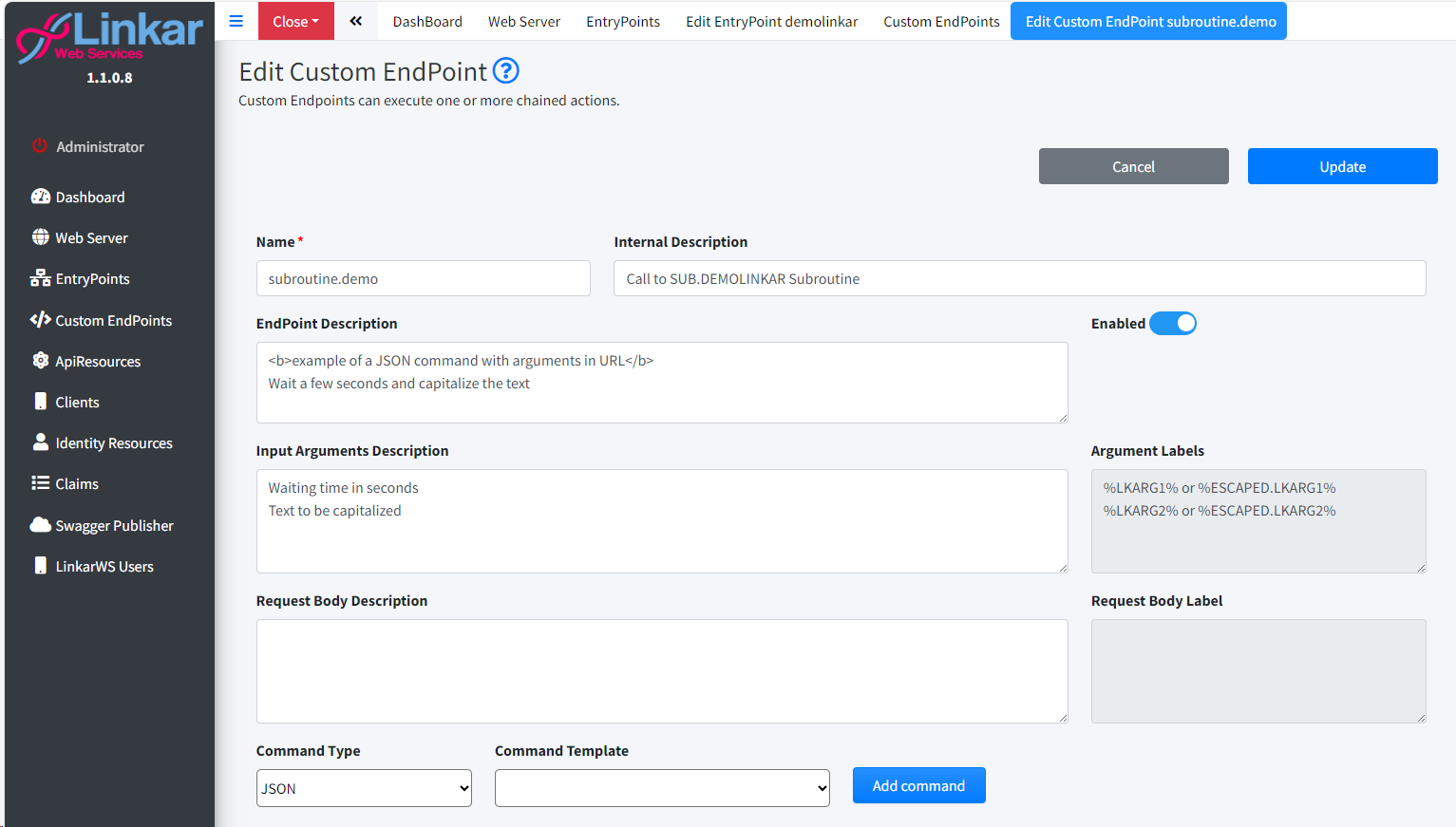 We must choose the template or templates of the sendcommand to be executed in this EndPoint. To do this we first define the type of command JSON or XML, and choose one of the templates available in the combo box. Click the Add Template button and the command structure will be painted in the Commands box. The possible labels to be used within the command are as follows: o%LKARGn% and %ESCAPED.LKARGn% n is a number from 1 to x. There are as many labels as you have parameters in endpoint. . ./api/v1/apidemo/custom/subroutine.demo?arg1=2&arg2=aa. %LKARG1% will be replaced by the value of arg1, and so on. The "ESCAPED" tag is used to replace escaped values. o%LKBODY% and %ESCAPED.LKBODY% If the endpoint is of the POST type where the input data must be in the Body of the request, we will use this tag to substitute it for the value contained in the Body o%LK.OUT:<expression>% This tag when you want to execute chained commands. LinkarWS allows us to execute a sequence of sendcommand type commands within the same custom endpoint. And this tag allows us to pass values from one response to the input of the next command. With an example it will be better understood: ../api/v1/apidemo/custom/demo.in.cascade?arg1=2&arg2=11 { "NAME" : "READ", "COMMAND" : { "CALCULATED" : "False" , "CONVERSION" : "False" , "FORMAT_SPEC" : "False" , "ORIGINAL_RECORDS" : "False" , "CUSTOM_VARS" : "" , "OUTPUT_FORMAT" : "JSON" , "FILE_NAME" : "LK.CUSTOMERS" , "DICT_CLAUSE" : "", "RECORDS" : [ { "LKITEMID" : "%LKARG1%" } ] } }, { "NAME" : "SUBROUTINE", "COMMAND" : { "SUBROUTINE_NAME" : "SUB.DEMOLINKAR" , "NUMBER_OF_ARGUMENTS" : "3" , "ARGUMENTS" : [ { "ARGUMENT" : "0" } , { "ARGUMENT" : "%LKOUT:COMMAND.RECORDS[0].NAME% - %LKARG2%" } , { "ARGUMENT" : "" } ] , "CUSTOM_VARS" : "" , "OUTPUT_FORMAT" : "JSON" } } The first command executes a READ of Register 2 of File LK.CUSTOMERS. The second command executes a SUBROUTINE, and one of its input arguments is the expression COMMAND.RECORDS[0].NAME which is extracted from the result of the first command.