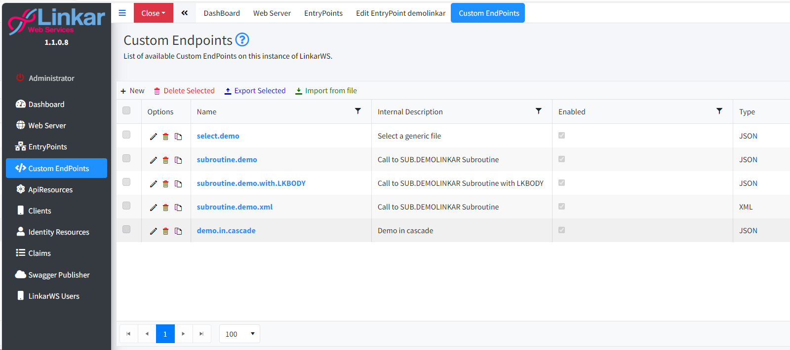 LinkarWS allows to create custom EndPoints to execute any of the operations defined in the sendcommand function of Linkar Server.