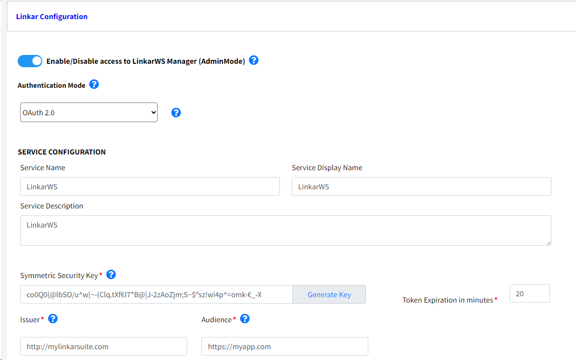 Use this option to enable/disable access to LinkarWS Manager, to avoid unwanted login attempts. If this option is disabled, it will be necessary to access the AppSettings.json file and set the 'AdminMode' field to true in order to access LinkarWS Manager again.
