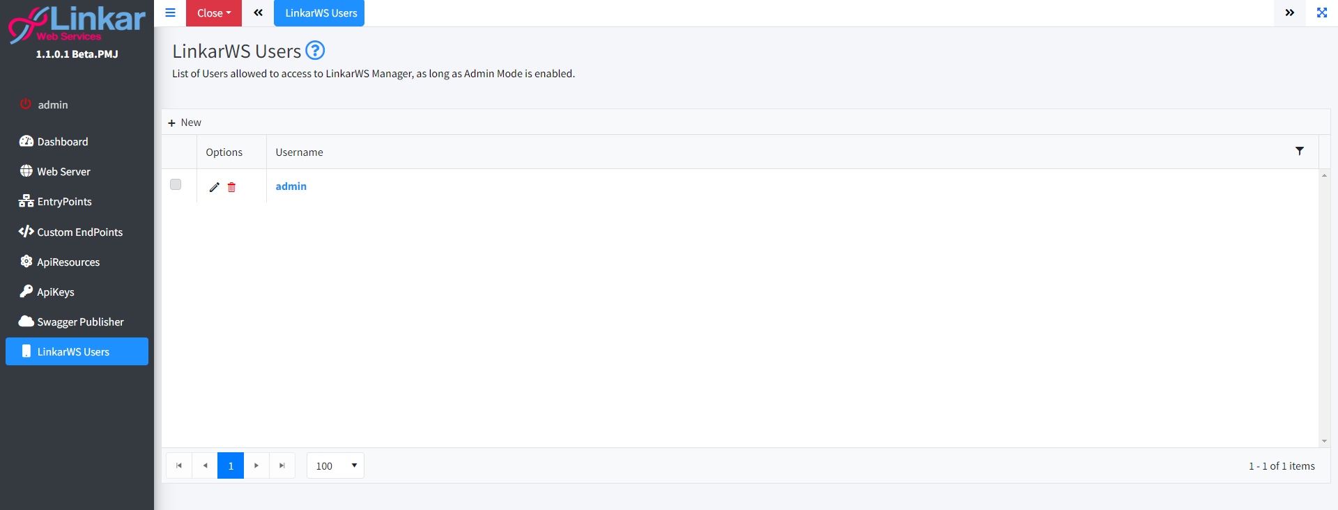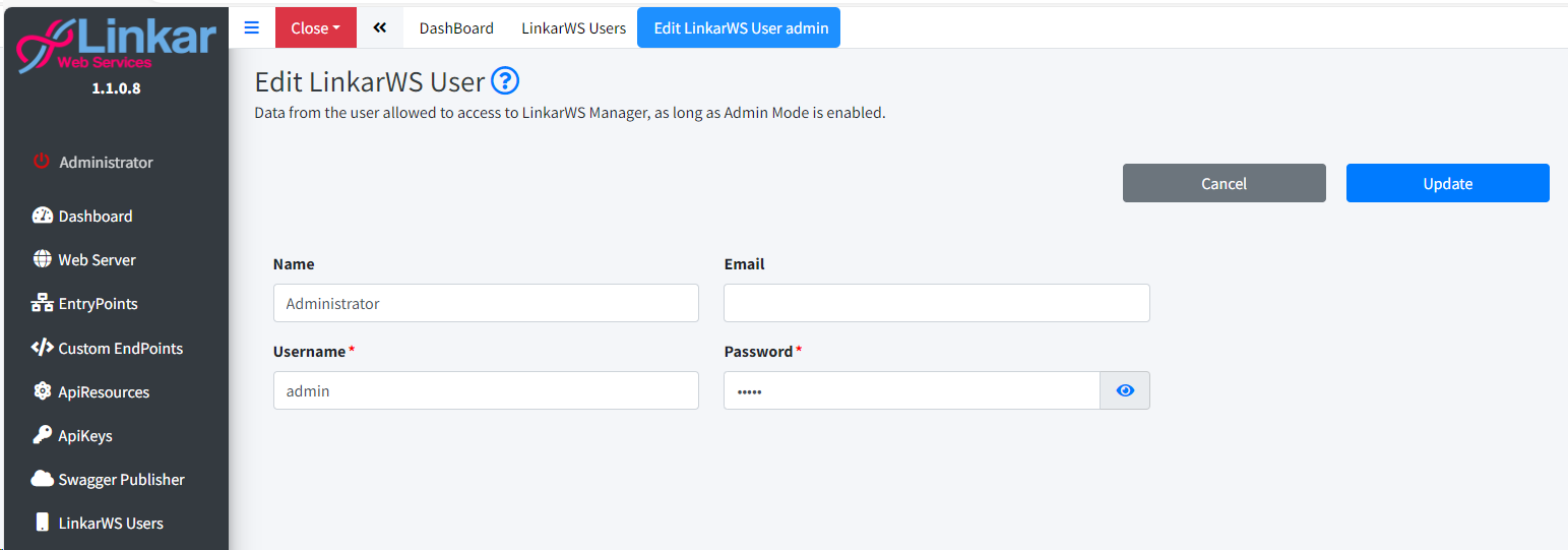 This section allows managing and modifying user data already existing in the database. These users are only valid to login in LinkarWS Manager.